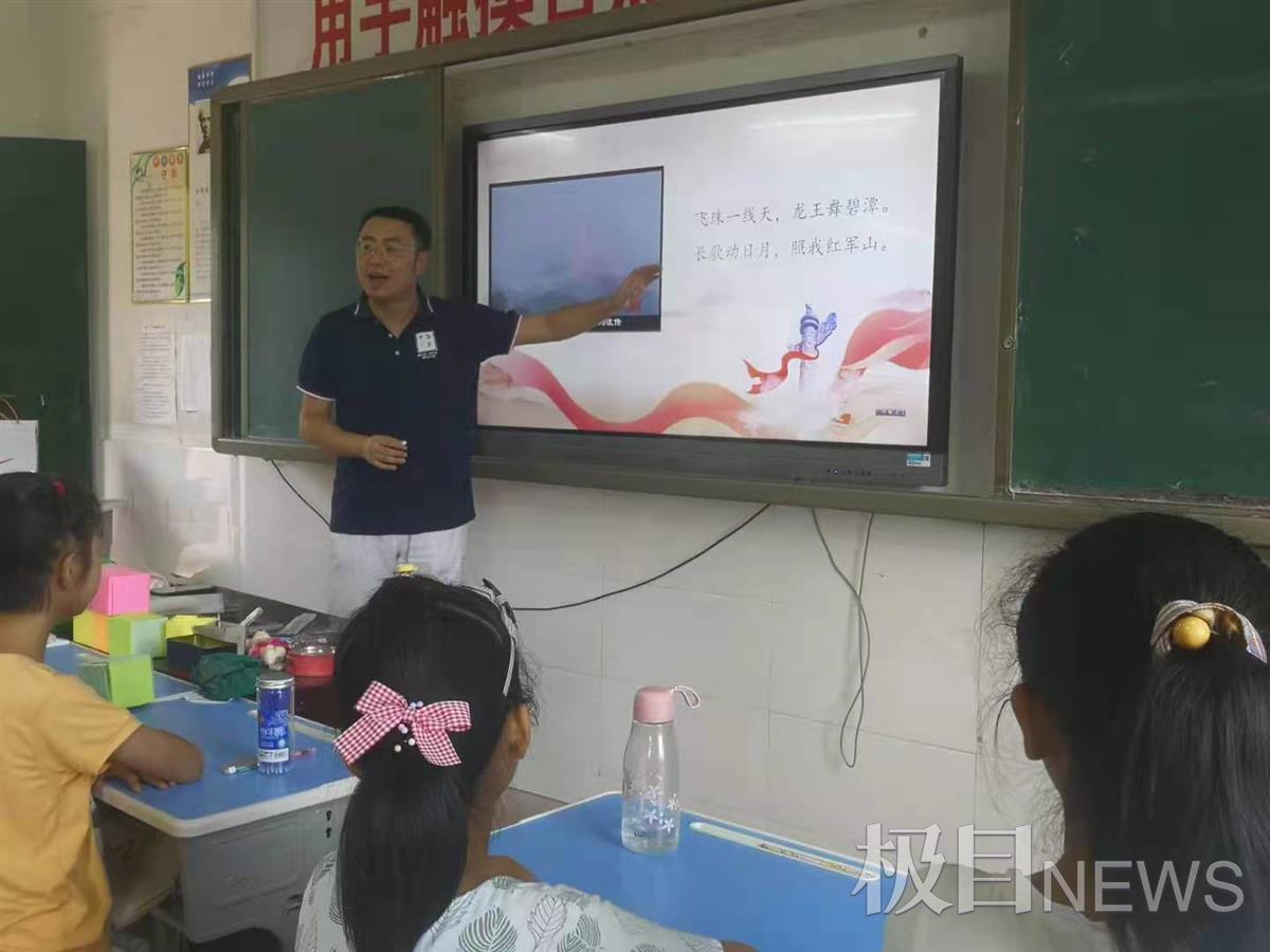 在支教活动的中后期,“陌上花开”的每一位志愿者都结对联系了三到四名小学生,他们彼此交换了联系方式。志愿服务队的指导老师、beat365正版唯一官网必一辅导员袁勋给四十余位少先队员上了一堂《红色通山与通山少年》的微党课,通过讲述红色通山的革命故事,从时间轴上由远及近地带着在场的少先队员们找寻通山土地上的红色基因。