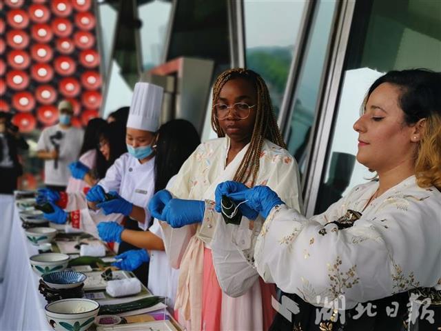 卷粽叶、装糯米、捆细绳……武汉万达瑞华酒店的厨师们为留学生讲解端午的由来和有关风俗习惯,以及粽子是如何制作的。留学生们身穿汉服、手捏粽叶,体验粽子的制作过程。来自突尼斯的留学生海悦捧着包好的粽子,喜笑颜开地说:“这是我第一次动手包粽子,很有成就感。”