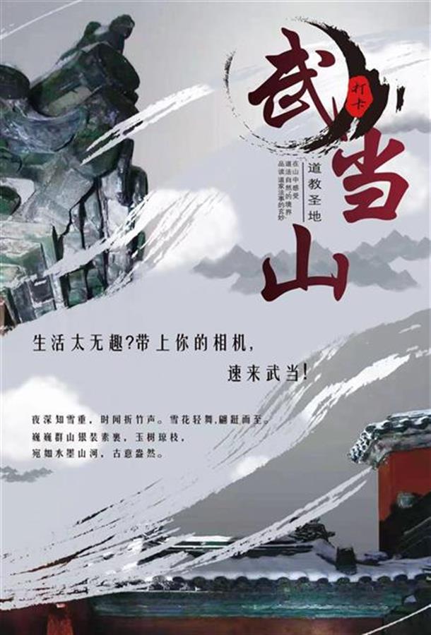 水墨打底,山水为画,布满白雪的斗拱屋檐,若隐若现地埋藏在云海山脉之中,一幅极具大片即视感的海报,一展出便吸人眼球。“武当山作为道教名山,蕴含了自然、清净无为的思想内涵。”卢麟瑾说,“我们小组通过虚实结合的手法,将印章、庙宇、水墨笔触等元素进行有机融合,希望呈现出国风水墨的清冷质感,打造道家文化的独特意境。”