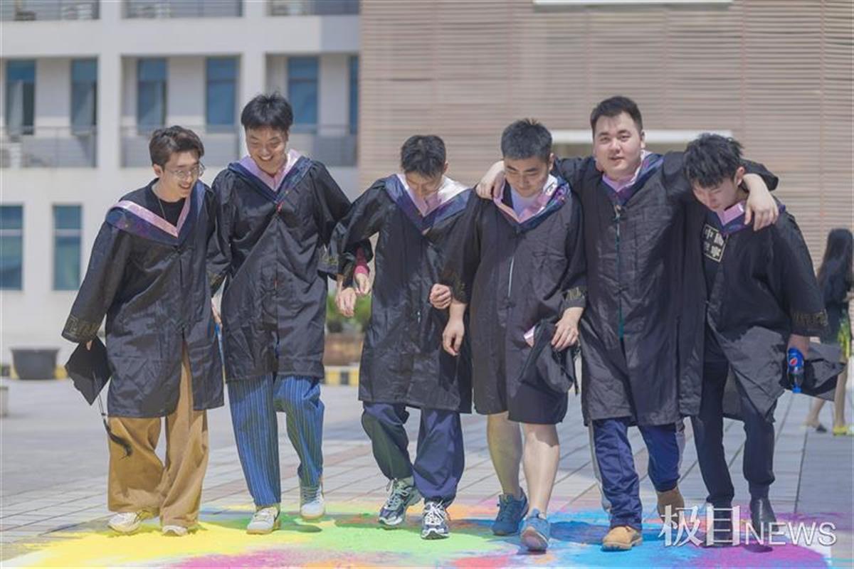 伴随着毕业季的专属音乐,257名毕业生们结伴同行、有序“进场”,鞋底沾上自己喜欢的彩粉,手拿花束或气球,一路从最初的阳逻校区“平江东路”走到校本部“友谊大道”,再到学院所在的“逸夫楼”,一步一印,形成一条绚丽的“彩虹启航路”。