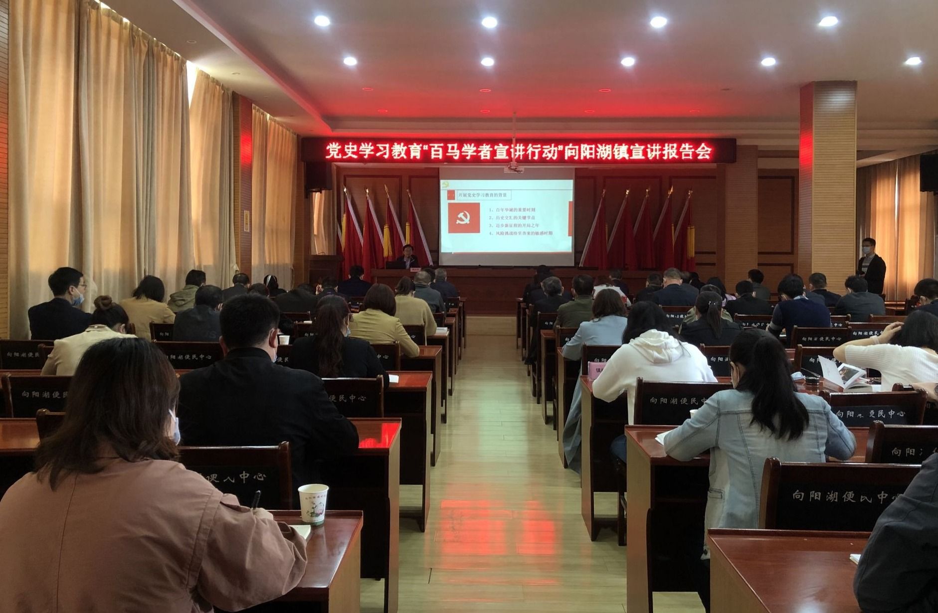 云上咸安报道(咸宁台记者:陈宗谱)4月23日,党史学习教育“百马学者宣讲行动”走进咸安区向阳湖镇。宣讲报告会在向阳湖镇政府和北岭村、祝垴村、凤凰小学4个会场进行,镇、村(社区)党员干部,镇内企业党组织书记、部分群众代表200余人聆听了报告。