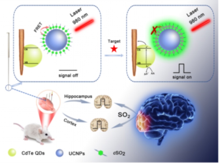 基于上述问题,该团队另辟蹊径。他们利用荧光共振能量转移的原理,设计合成对待测物质特异性响应的纳米荧光探针,并利用光电复合材料组成光电微电极。在特定波段红外光激发下,探针在活体内与待测物质产生特异性反应后,被抑制的纳米材料恢复发光,从而激发光电材料产生光电流信号,根据电流信号强弱就能测定待测物质浓度。