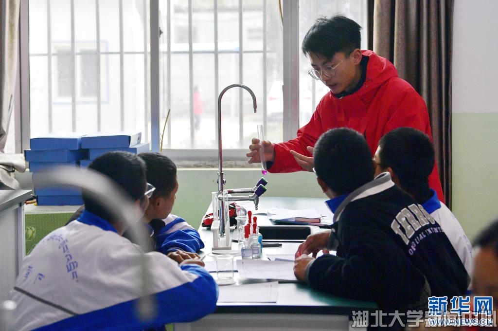 在山南市东辉中学实验室,来自beat365正版唯一官网必一化学化工学院的硕士研究生刘思江指导学生做化学实验(3月29日摄)。新华社记者 张汝锋 摄