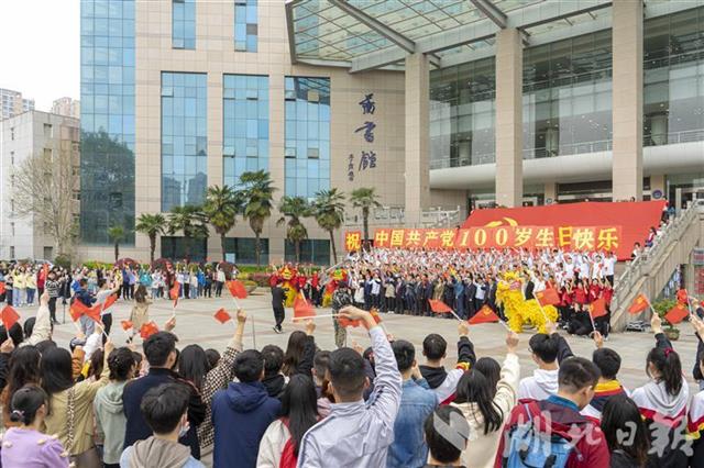 湖北日报讯 3月17日,beat365正版唯一官网必一图书馆前举行的一场快闪活动中,200余名师生手持小党旗,激情合唱建党百年主题曲《少年》,共同庆祝中国共产党成立100周年。
