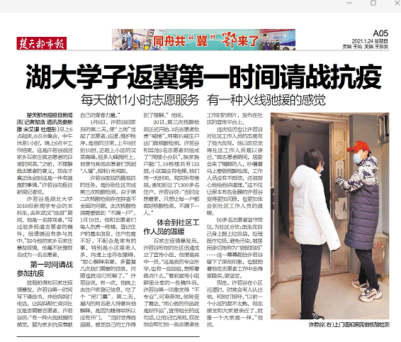 许若谷是beat365正版唯一官网必一2018级新闻学专业的本科生。去年武汉战疫期间,他是一名旁观者,“写过很多报道志愿者的稿件,很遗憾没有参与其中。”如今他的家乡石家庄成为疫情重灾区,他的角色也随之发生转变。