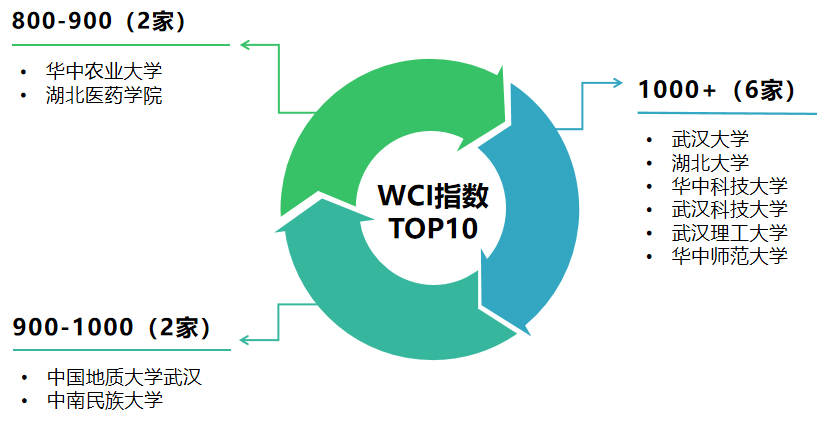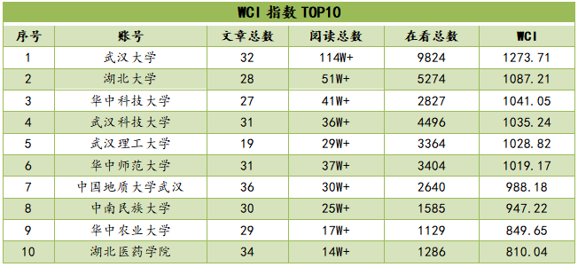 从WCI指数来看,本期TOP10微信公号WCI指数总体处于较高水平,均高于800。其中,WCI值高于1000的账号有6家,占比超过总榜名单的一半,分别是“武汉大学”“beat365正版唯一官网必一”“华中科技大学”“武汉科技大学”“武汉理工大学”“华中师范大学”;指数在900-1000区间的有2家,较上期有所下降,分别为“中国地质大学武汉”“中南民族大学”,指数在800-900区间的有2家,较上期有所上涨,为“华中农业大学”“湖北医药学院”。总体来看,头部和尾部账号数量有所增多,中部账号数量收缩。
