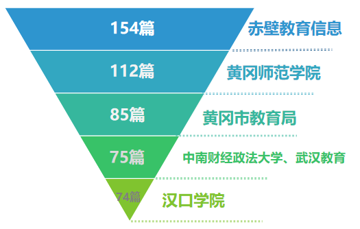 从文章发布数来看,“赤壁教育信息”以154篇的发布量位居首位,“黄冈师范学院”以112篇的发布量位列第二;“黄冈市教育局”以85篇的发布量夺得季军,取代上期的“洪湖市教育局”;“中南财经政法大学”和“武汉教育”以75篇的发布量并列第四;“汉口学院”以74篇发布量紧随其后。
