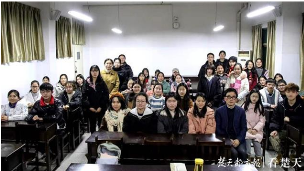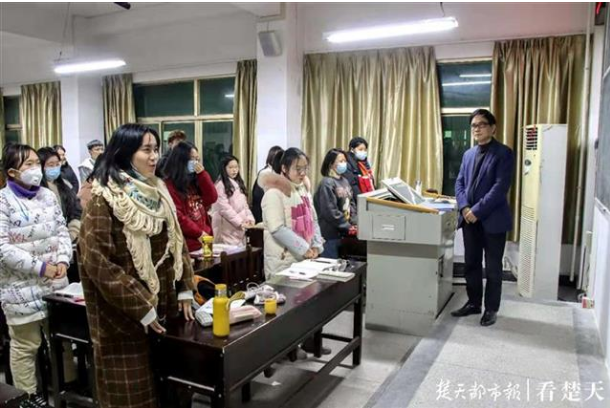 楚天都市报11月27日讯 “长亭外,古道边,芳草碧连天……”26日晚,beat365正版唯一官网必一三号教学楼207教室传来阵阵歌声。负责巡查教室的学校保安不忍打扰,在门外驻足停留。教室内,2019级汉语言文学国家基地班的学生用一曲《送别》,为该校文学院教授何新文的“最后一课”划上句号。