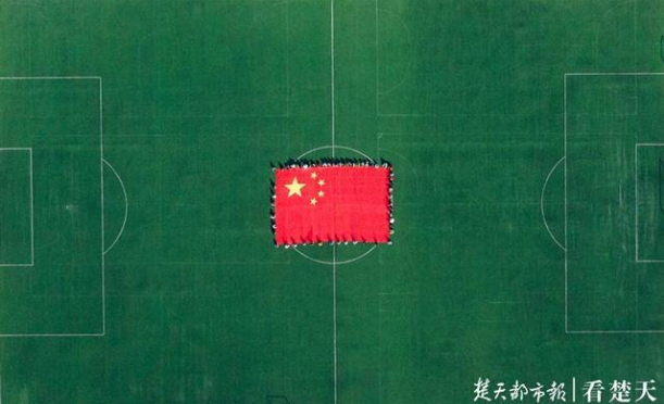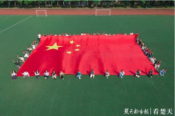 在该校运动场,60余名大学生记者举起上百平米的巨幅国旗,与国旗亲切合影,祝愿伟大祖国繁荣昌盛。