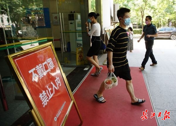 餐厅门前竖立“不戴口罩禁止入内”的提示牌。