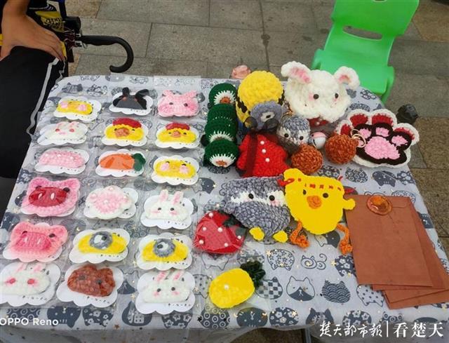 钩针发卡、小黄人玩偶、杯垫……一件件精致的织品整齐陈列在老河口市滨江公园摊位上,引来不少路人驻足。这些织品都是由“老板”钱千东亲手缝制的。疫情期间,钱千东利用宅家的空闲时间,学习钩针编织,随着针织技艺的提升,家里的织品也越来越多,她便萌生了摆摊的想法。