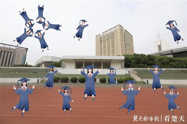 记者看到,在这些毕业照里,毕业生们身穿学士服,在图书馆、操场、体育馆等建筑物面前摆出各种各样的姿势:站在地上、飞在天上、手拉手呈太阳花形状……“我竟然在毕业照里实现了飞天梦想!”毕业生刘琴将自己的照片截图分享到了QQ空间,照片里,她笑容灿烂,“飞翔”在半空中。
