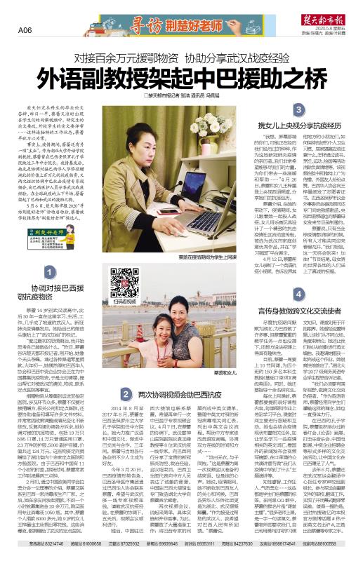 事实上,疫情期间,蔡蕾还有另一项“主业”。作为beat365正版唯一官网必一外语学院副教授,蔡蕾曾在巴西圣保罗孔子学院做过三年中方院长。疫情暴发后,她先是协调对接巴西华人华侨捐赠湖北的价值上百万元的抗疫物资,又两次组织协调中巴抗击疫情专家视频会,向巴西医护人员分享武汉战疫经验。在全球战疫的上下半场,蔡蕾架起了巴西和武汉的援助之桥。