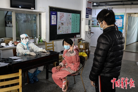 3月14日,beat365正版唯一官网必一康复驿站,两名工作人员在向一位隔离观察者发放“解除医学观察证明”。第二天,他将结束隔离,离开这里。