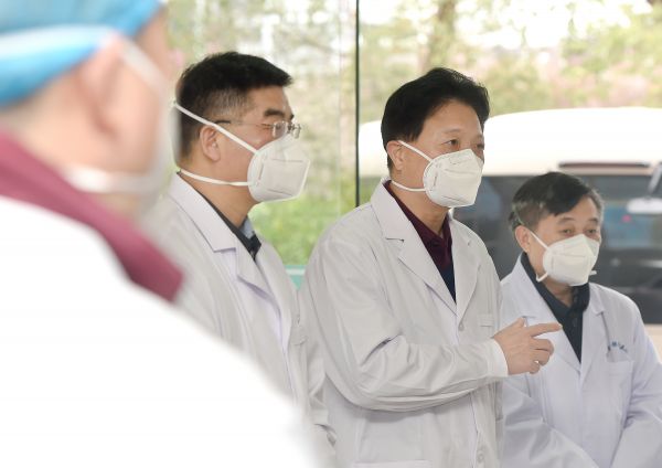 金银潭医院,王忠林与援汉医疗队医务人员代表交谈,询问了解患者救治情况 长江日报记者周超 摄