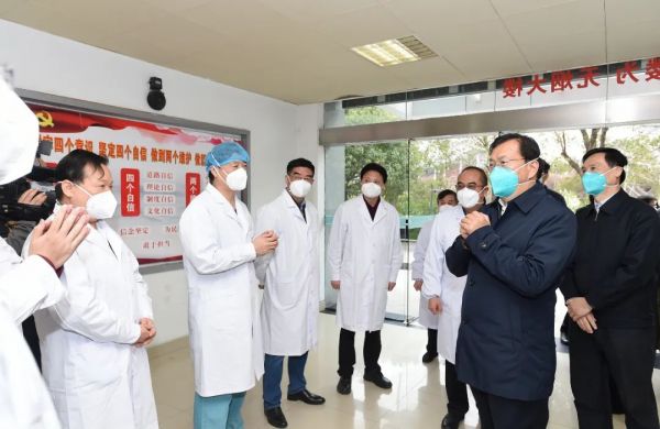 来到金银潭医院,王忠林看望慰问援汉医疗队代表等一线医务工作者,与金银潭医院党委副书记、院长张定宇交谈,询问了解患者救治情况。