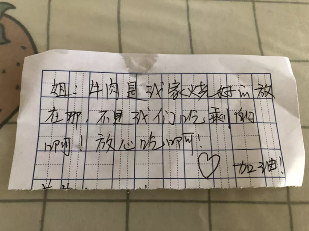 “姐,牛肉是我家烧好的放在那,不是我们吃剩的,放心吃啊!加油!”