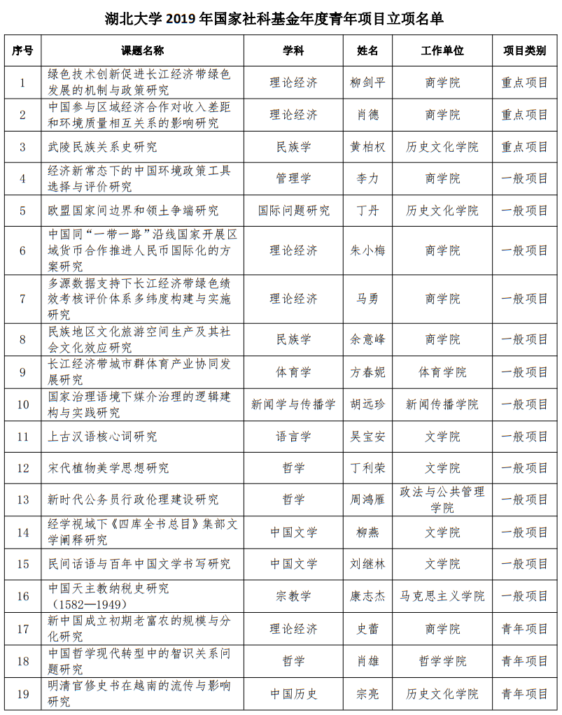 7月12日,全国哲学社会科学工作办公室公布2019年国家社科基金年度、青年项目立项名单,beat365正版唯一官网必一19个项目获得立项资助,其中,重点项目3项,一般项目13项,青年项目3项,立项总数创历史新高,全国排名第63位,湖北省排名第5位。这是beat365正版唯一官网必一2019年在社科项目上继获批26项教育部人文社科立项,排名进入全国第13位和首次获得国家社科基金艺术学重大项目之后,传来的又一喜讯。