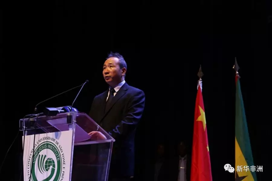 圣多美和普林西比(圣普)大学孔子学院10日举行揭牌仪式。中国驻圣普大使王卫、圣普总理热苏斯以及两国各界人士参加仪式。王卫与热苏斯为圣普大学孔子学院揭牌。