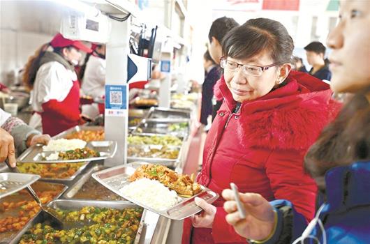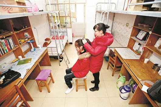 图为:下课了,丁美瑛牵着女儿赶往下一个教室图为:去食堂打饭
