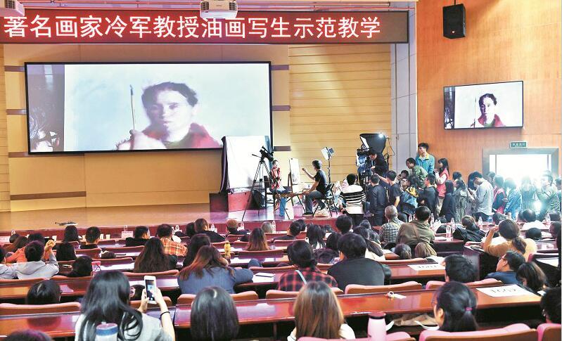 上午,冷军从10时画到12时,下午从2时画到近7时。7个小时的绘画过程中,冷军非常详细地与学生们分享了创作经验和心得。“画画不是搞生产,不要拘泥于某个方法,所以对每幅画我都诚惶诚恐,艺术里面有无穷的学问”。作画时,冷军一声不吭,每个作画阶段结束搁笔后,才把刚才的过程诠释清楚。